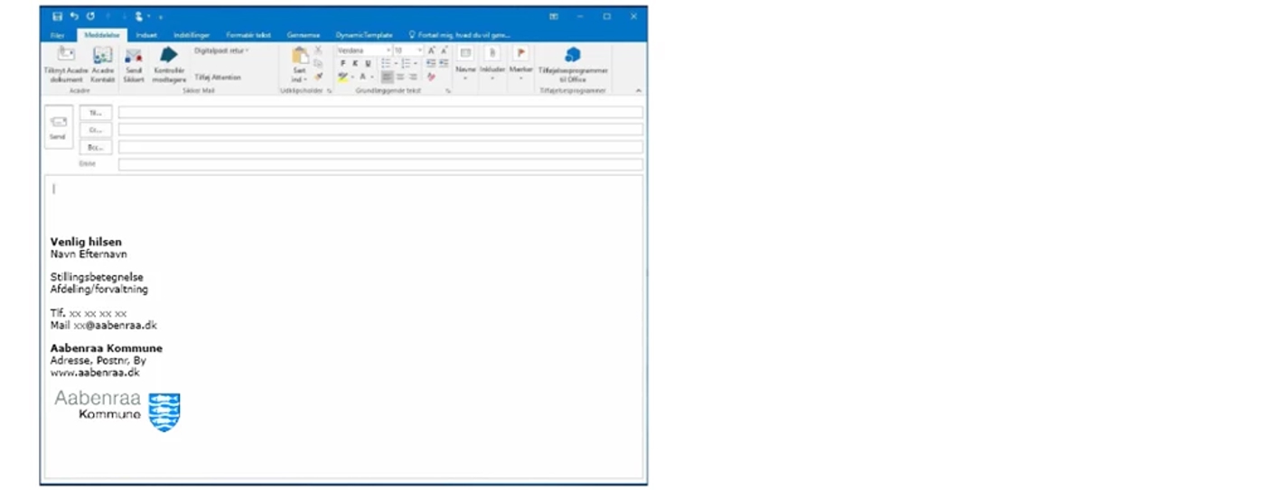 E-mails fra kommunen skal være ensrettede og indeholde en signatur med relevante informationer om afsenderen og kommunen. Derfor benyttes en standardsignatur ved alle mails, der sendes.