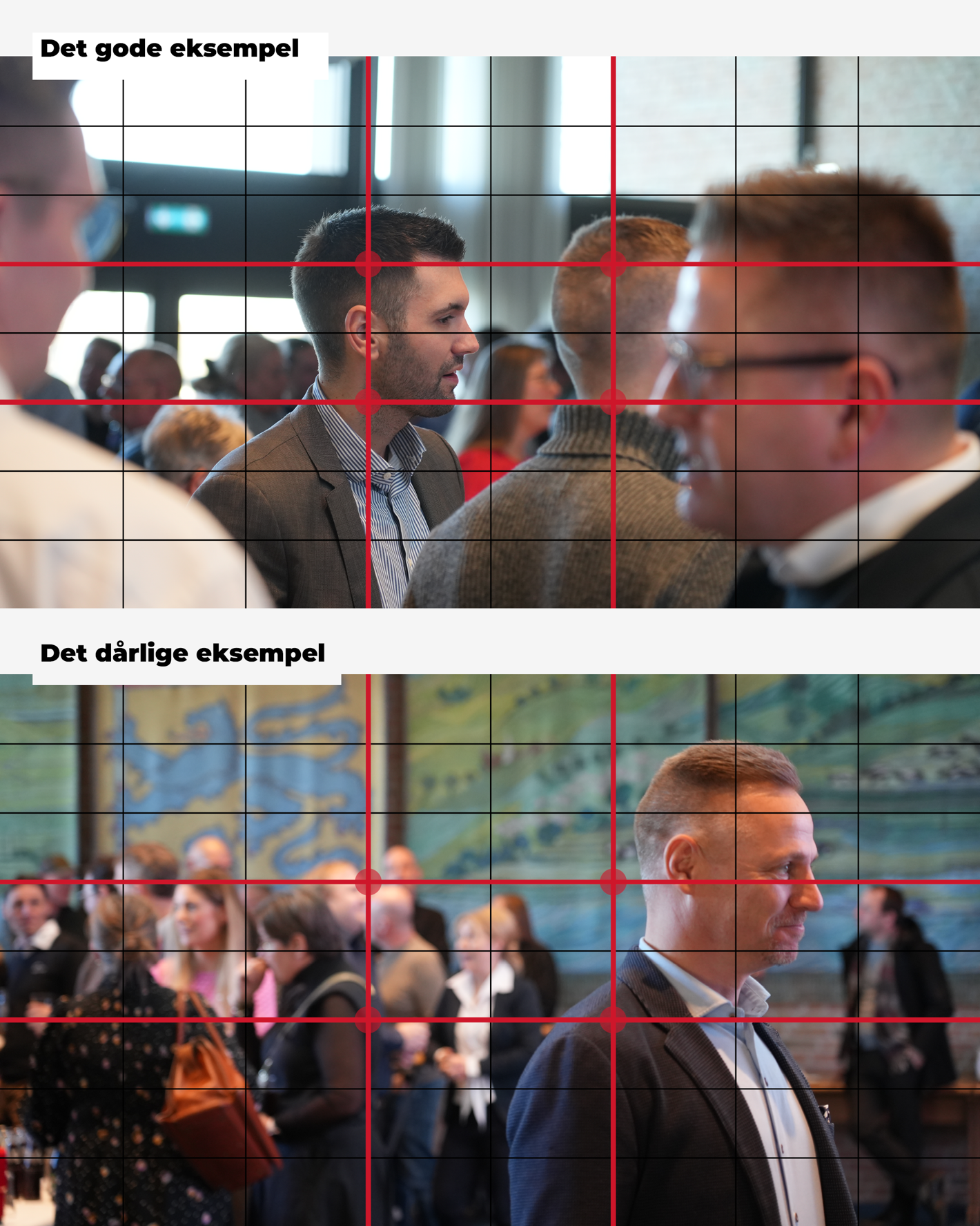 Vælg et element i motivet, som naturligt fanger øjet. Blikfanget kan være en person, en bygning eller et objekt, der skiller sig ud og giver billedet fokus. Placer blikfanget i det gyldne snit (se nedenfor).