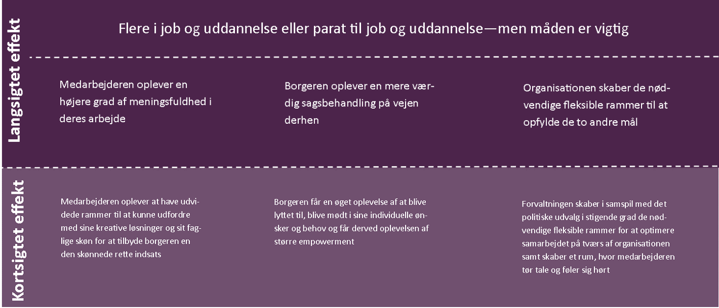 Ved at give medarbejderne større rum og fleksible rammer til at give borgerne en individuel sagsbehandling vil både borgere og medarbejdere op-leve en større grad af værdighed og meningsfuldhed i forløbet og det vil føre til flere i job og uddannelse eller parate til at komme i job og uddannelse.