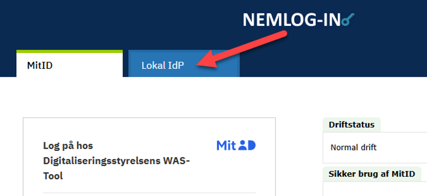 Åben siden, som du ønsker at åbne med MitID Erhverv. Vælg fanen Lokal IdP
