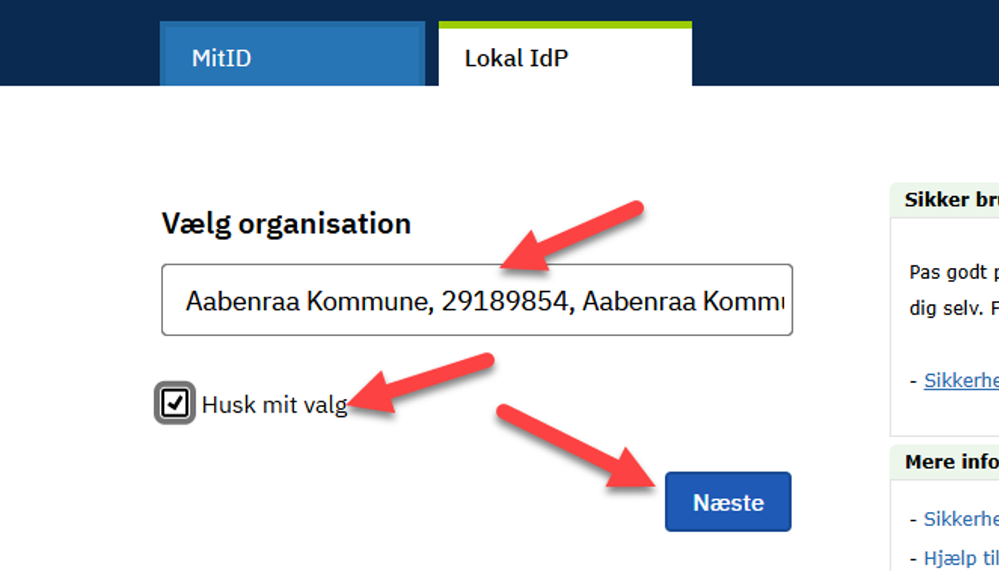 Vælg ”Aabenraa kommune…” - Sæt flueben i Husk mit valg - Tryk på Næste