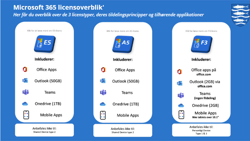 Beskrivelse af M365 F3, A5 og E5-licenser