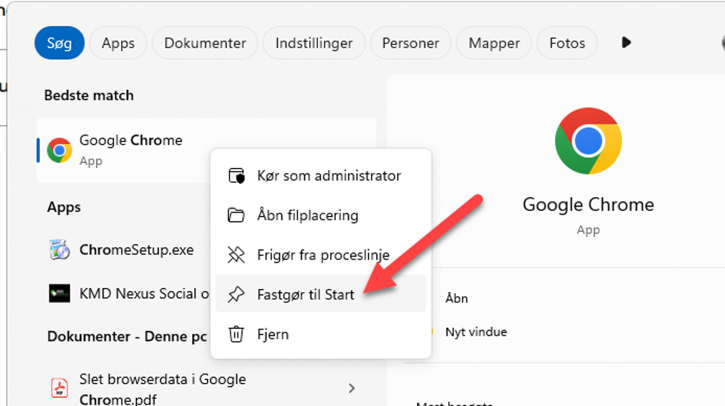 Hvis du ønsker at lægge dit program i startmenuen, så skal du højreklikke på programmet, og vælge Fastgør til start.