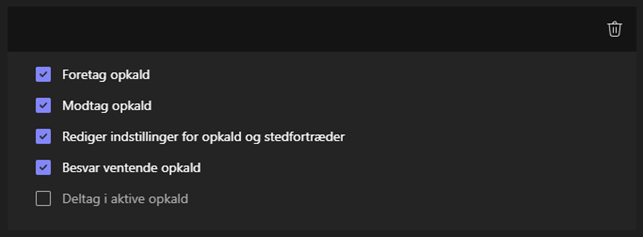 Foretag opkald: Brugeren må ringe ud med dit nummer eller som din bruger i Teams til Teams opkald.