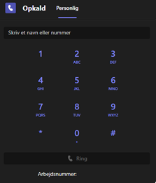Derefter hvis man har et nummer i Teams har man et numerisk tastatur, hvor man kan indtaste det nummer man vil ringe til. I bunden af tastaturet kan man se ens eget nummer.