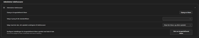 Hvis du vil bruge Text-to-speech så vælg først dit sprog i ”Vælg et sprog til din standardhilsen” derefter tryk på ”Skriv en brugerdefineret hilsen”. Husk at Text-to-speech ikke forstår dobbelt a, så benyt å i stedet for.