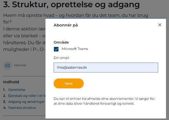 Eksempel: Abonnerer du på siden Struktur, oprettelse og adgang, abonnerer du på hele Microsoft Teams-området og alle dets undersider.