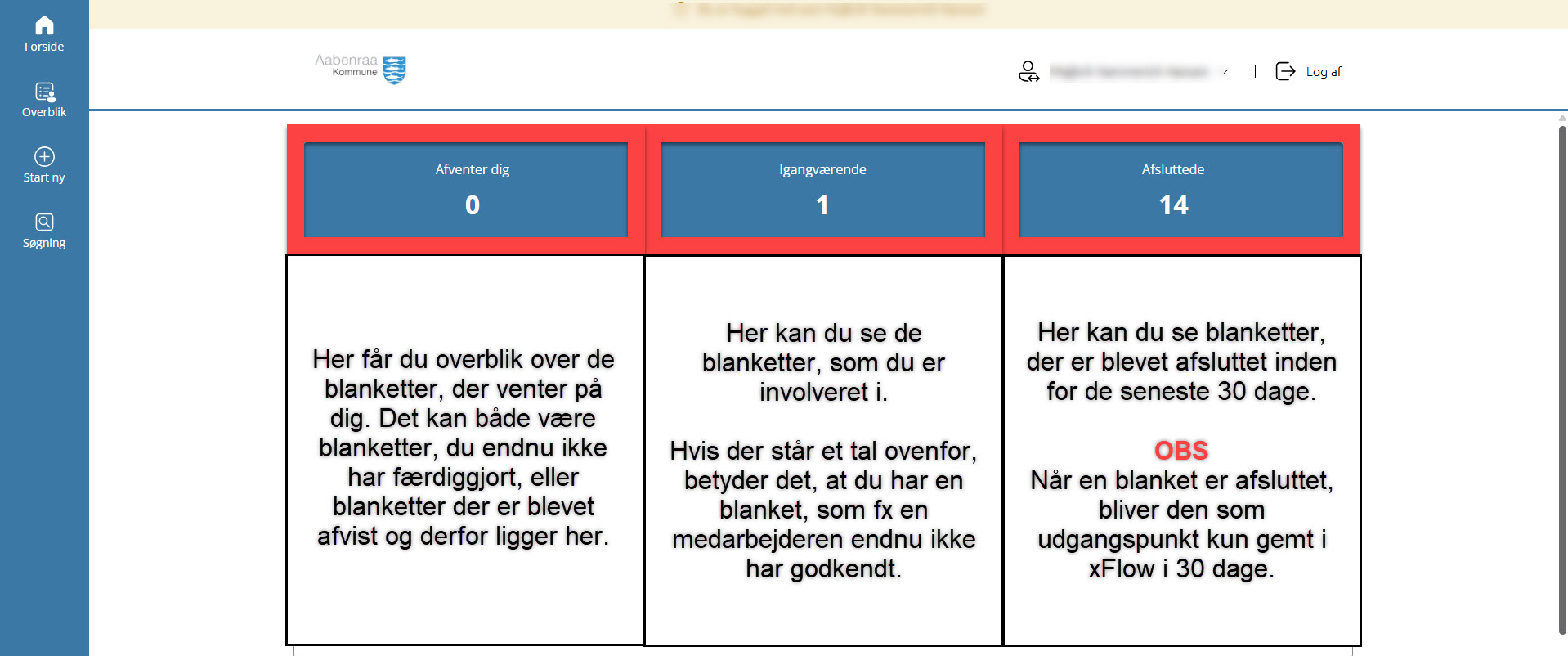 Hvis du i xFlow vil tjekke, om der er blanketter, der afventer dig, eller andre igangværende blanketter, som du er involveret i, kan du finde dem her.
